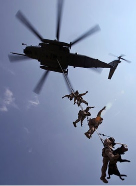 A special set of Load Bearing gear made to be compatible with the Special Patrol Insertion/Extraction system. Sounds complicated. It's basically a system where the chopper dangles the entire squad of grunts from a rope for quick insertion and extraction! This may be a USMC specific item. While the above picture shows a pistol belt in the loops, I belive the rappel seat was meant to be in these loops.