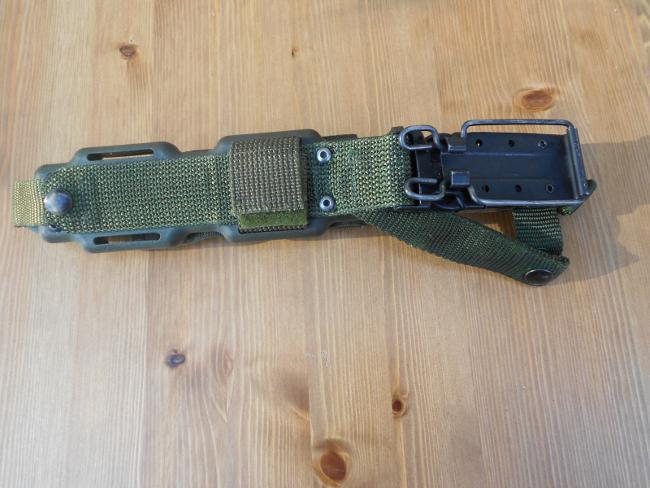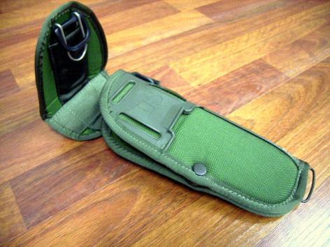 This replaced the M10 scabbard and the M7 bayonet for the M16 series, it's a lot more usefull then the previous one as it has a pouch on the side for a small knife, a pistol magazine, or a sharpening stone. The scabbard is designed to used with sheathed blade as a saw or wire cutter. Because of this there is a detachment clip to allow the bayonet to be removed from the clip while still in the scabbard. While this uses the Bianchi designed and licensed clip to attach it to the belt, The scabbard is also used for the M11 EOD knife.