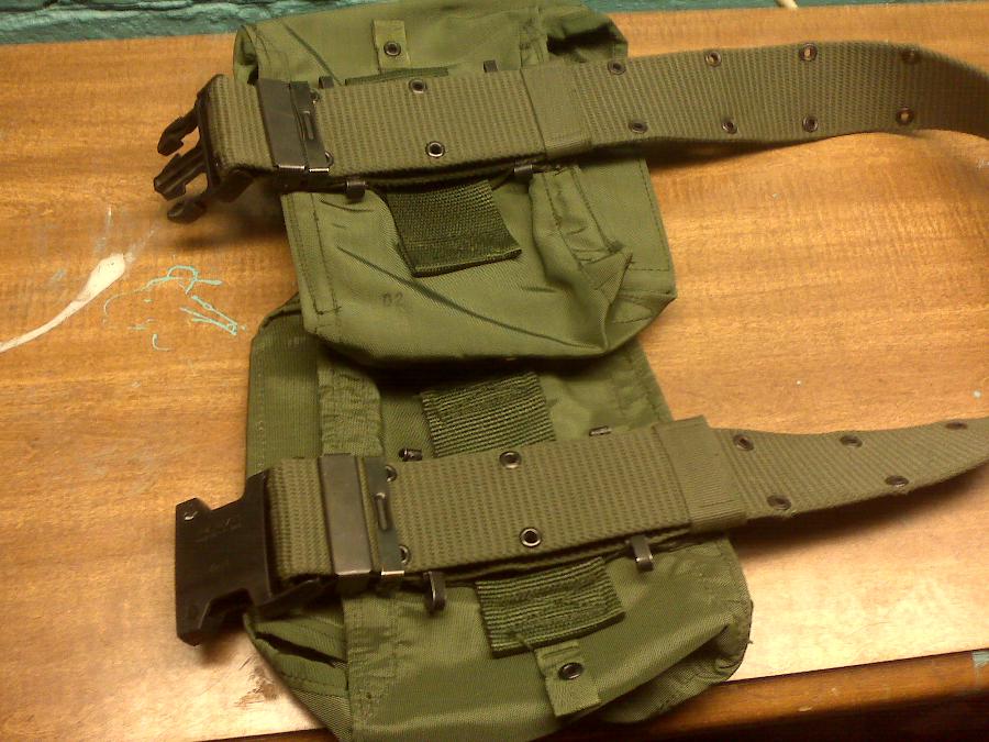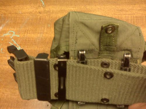 Attach the Alice mag pouches as shown in the picture. You want the eyelet on the pouch to be just above the first eyelet on the non folded over portion of the belt. (see the pics). Put both on like seen in the photos. If your using the ALICE M249 SAW pouches or the M1956/M1967 pouches. Notes on them will be at the bottom of this web page. If your not going to run ammo pouches, just clip to the hole on the non folded over portion of the belt one spot away from the buckle.