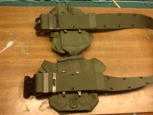 The first step is to size the belt to your Mk1 Gut LOL. You want the belt semi tight but not too tight. When your adjusting the belt you want the eyelets on the part that is folded back to be roughly symetrical. Easier said then done and it does take some practice. In the picture you see the three different type of ALICE belts. Note how the folded over portion on each has the holes and equal distance from the buckle. Not shown are the M1956 and M1967 belts, but the M1956 and M1967 belts adjust using the center row of holes, but should be adjusted the same as the others. If for some reason your using a M1961 or M1936 belt, they only adjust from one end, but can be made to work if you wish.