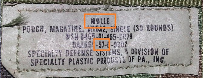 Collecting this stuff can be tricky!!!! These NSNs were just reused in MOLLE II, so when looking these up you will often find the more modern components. The best way is to look at the NSN tag. First. You want the tag not to say "MOLLE II" but just MOLLE at the top. You also want the year to be before 2001. Look at the image below. The top box is around the MOLLE you should be looking for. The second box is around the contract year.