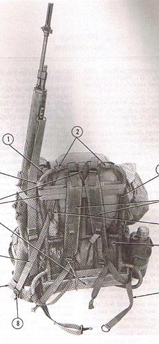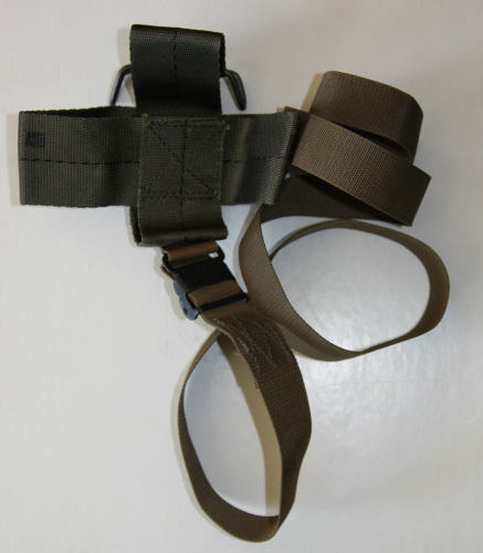 Now this is an obscure but very usefull item. This allows your rifle to be strapped to the side of your rucksack. Now in the Army this was so that ski troops could secure the rifle so that it would not obstruct the use of skis and ski poles. I just find it rather nice to get the rifle secured on my rucksack when I am navigating. It was designed for the lightweight rucksack, but it works just as well on the first generation LC-1 Medium alice rucks. Sadly later alice rucks had the grommets removed.